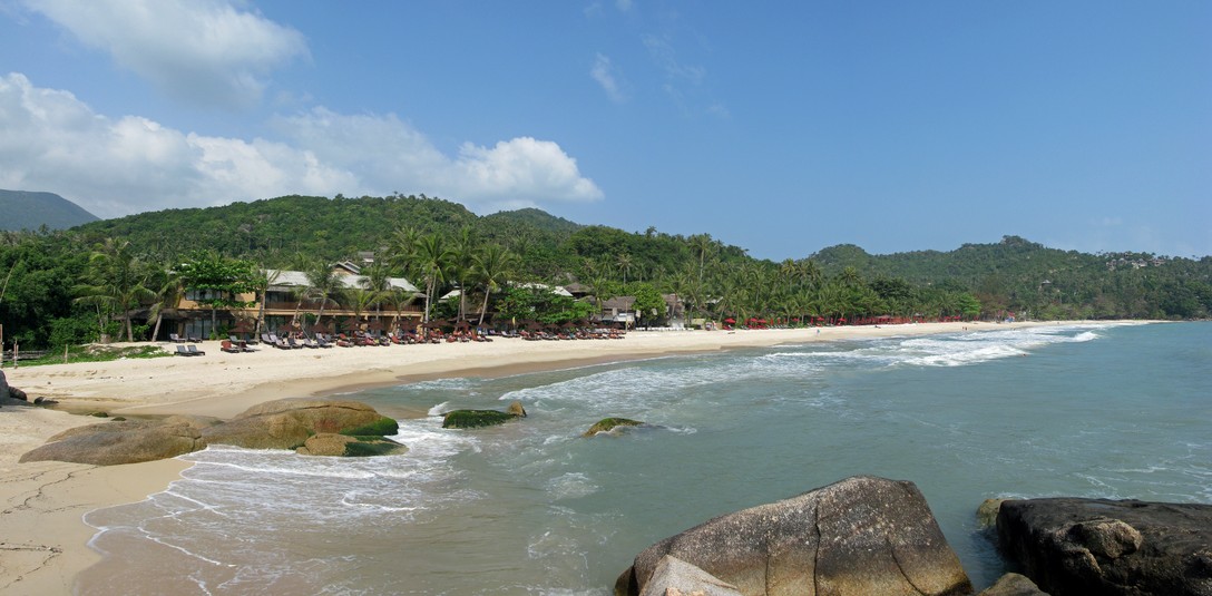 Blick auf die Bucht Thong Nai Pan Noi und das Buri Rasa Hotel. Die roten Sonnenschirme auf der rechten Seite gehören zum Anantara Hotel.