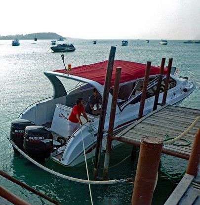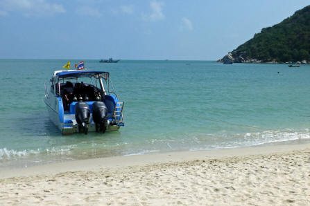 Um 10:00 starten wir am Phuwadee Resort und fahren zunächst mit einem Pickup zum Nachbarstrand, dem Thong Nai Pan Yai. Den sehe ich jetzt zum ersten Mal und finde ihn sehr schön: heller, feiner Sand mit türkisblauem Wasser. Es sind viele Leute im Wasser und das zeigt mir, dass man hier gut schwimmen kann. Im Gegensatz zu unserem Strand nebenan ist das Meer total ruhig und nur kleine Wellen rollen an den Strand. Dazu weht wenig Wind. Es ist erstaunlich, dass schon einen Kilometer weiter die Wasserverhältnisse total anders sein können.Das Speedboot mit den beiden 250 PS starken Außenbordmotoren liegt am Strand von Thong Nai Pan Yai. Hier starten die meisten Unternehmungen.