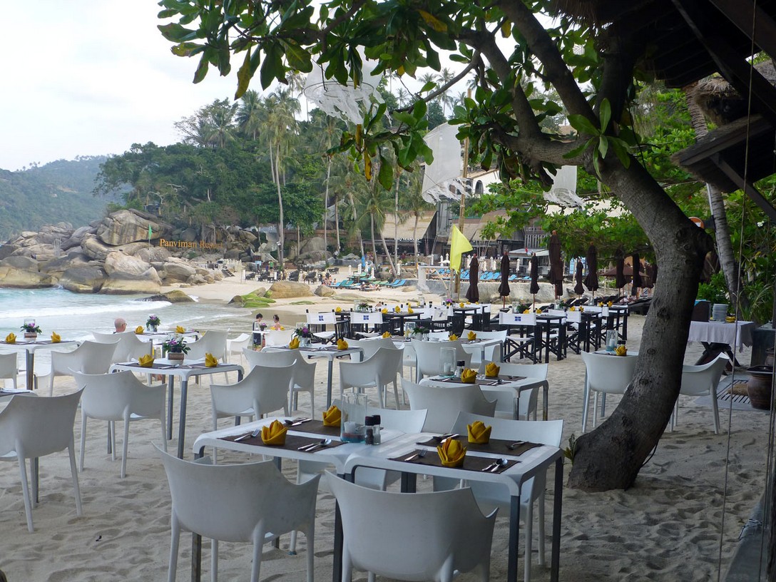 Zur Happy Hour werden in dem Beachclub- Restaurant die Tische und Stühle für das Abendessen in den Sand gestellt, weil viele Gäste - auch aus den Nachbarhotels - barfuß kommen und hier essen. An der Bar gibt es von 18 - 19 Uhr die Drinks zum halben Preis (120 BHT = 3,20 €). Das Bier ist dann auch preiswerter (0,5 l für 100 BHT, also für etwa 2,70 €.