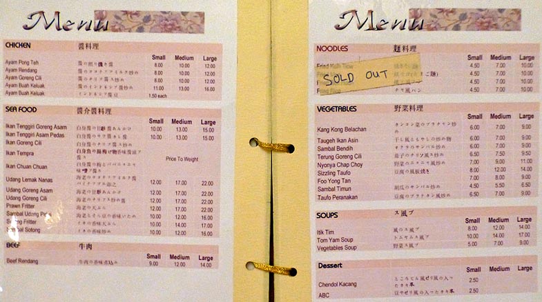 Wir fahren weiter in die Innenstadt von Melaka, wo uns Zul eine Mittagspause gönnen will. In einer Nebenstraße gehen wir in einem alten Herrenhaus essen, das zu einem Restaurant umgebaut wurde. Wir sind zum ersten Mal allein in fremder Umgebung und auf uns selbst gestellt, denn unser Reiseführer geht in der Stadt Verwandte besuchen. Im Restaurant spricht keiner Englisch. Wir studieren die Speisekarte, werden aber nicht recht schlau daraus, weil alles nur in Malaysisch oder Chinesisch angegeben ist.