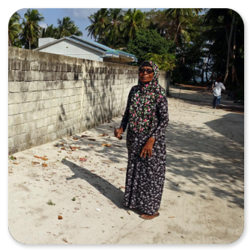Wir spazieren durch die Dorfstraßen und laufen an verschiedenen Häusern entlang. Die Frauen legen Früchte und Fische zum Trocknen auf Wellblechplatten aus. Jedes Haus hat eine Satellitenantenne. Das Wasser wird entweder in großen Behältern aufgefangen oder kommt als Trinkwasser von den Resort-Inseln, die alle eine eigene Wasserentsalzungsanlage besitzen. Die Stromversorgung auf der Insel wird durch einen großen Generator sichergestellt, der mit Diesel betrieben wird. Zu jedem Haus gehört ein kleiner Garten, der ähnlich wie auf dem oberen Bild aussieht. Meist werden Gurken, Melonen und Papayas angebaut, manchmal auch eine spezielle Art von Kartoffeln.