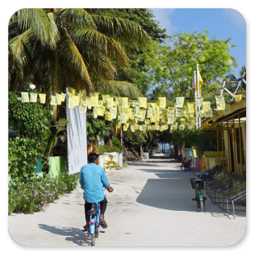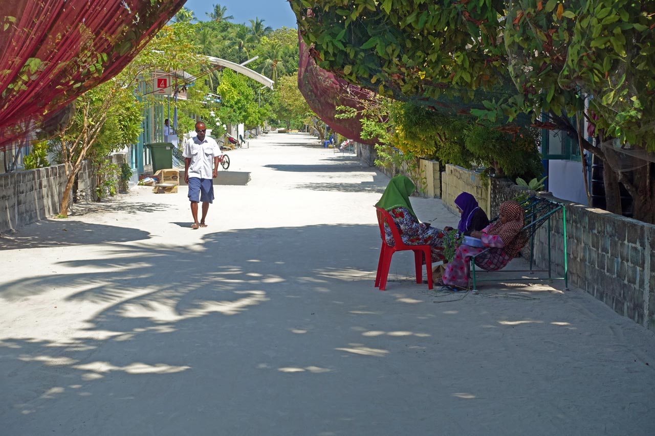 Die Kinder spielen fröhlich auf der Straße; von den 500 Einwohnern der Insel sind 92 Kinder. Im Unterschied zu den Kindern der anderen Inseln laufen sie nicht barfuß über die Straße, sondern haben Strandsandalen an den Füßen. Vor der Parteizentrale hat man eine Public-Viewing Leinwand eingerichtet, damit alle die Fußballspiele verfolgen können. Fußball ist die große Leidenschaft der Maldiver.