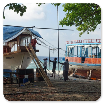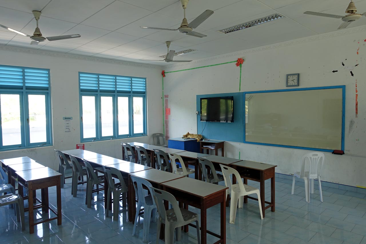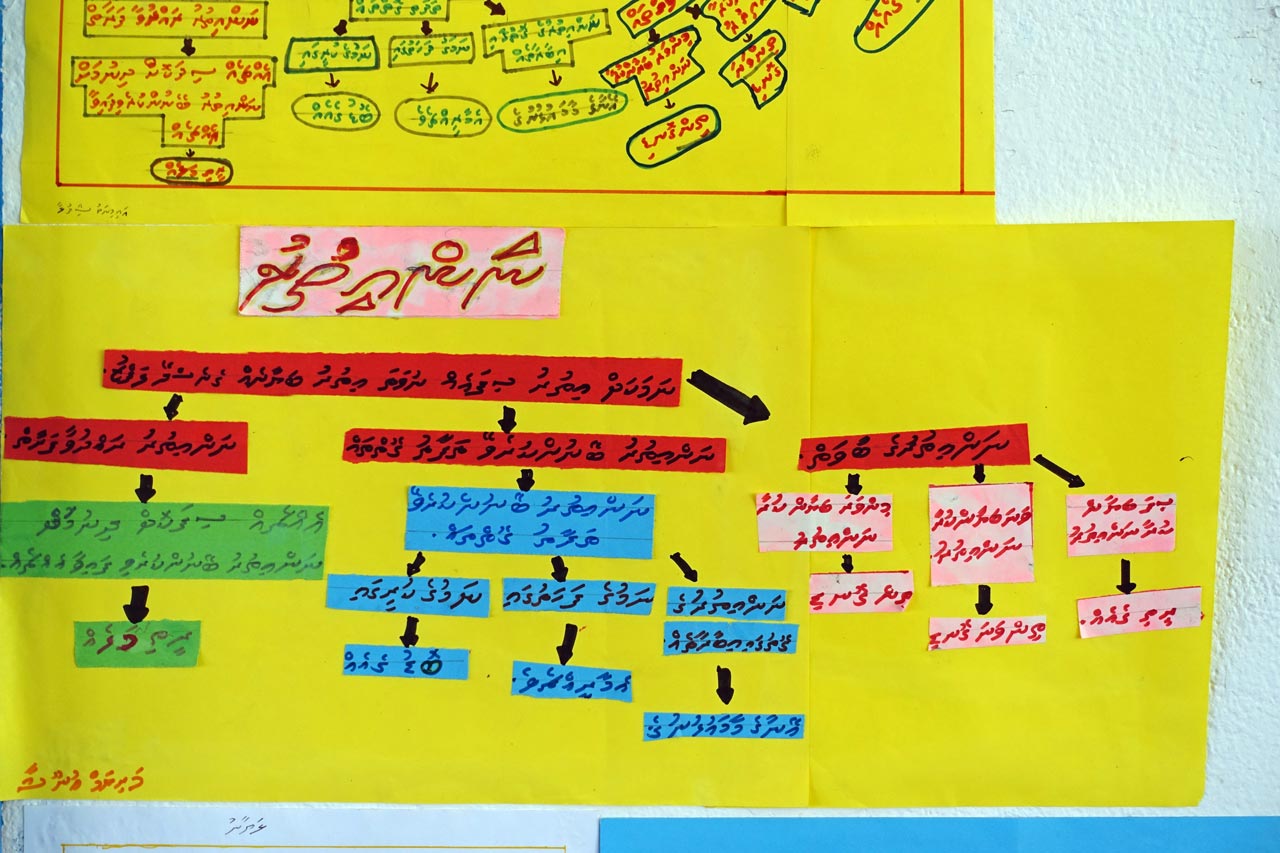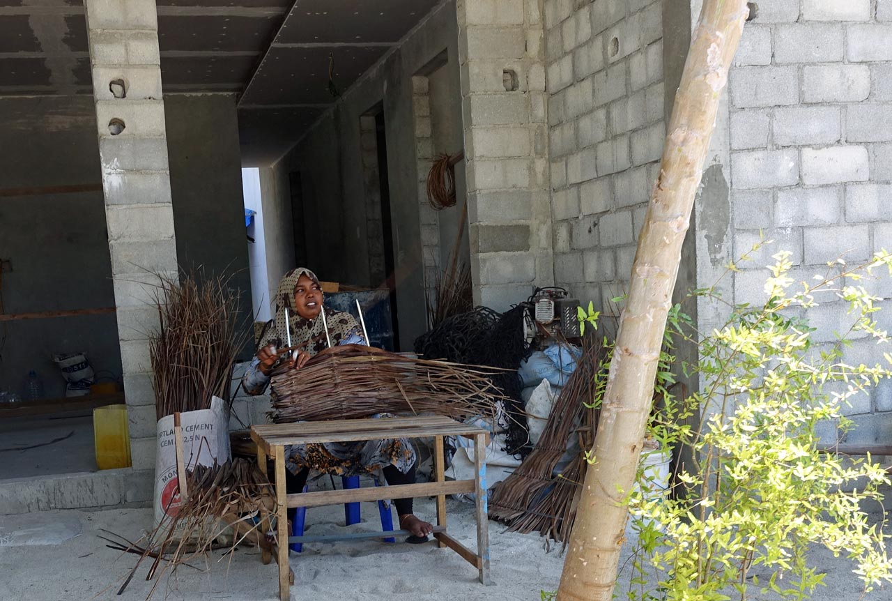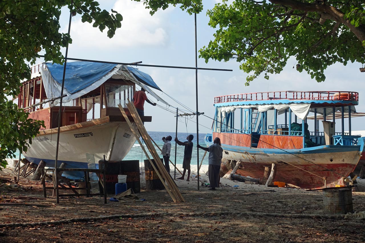 Die meisten Häuser werden jedoch aus einfachen Zementbausteinen errichtet und sind noch nicht fertig. Zur Miete wohnt keiner hier, sondern man muss heiraten und bekommt dann ein Grundstück auf der Insel zugewiesen. Dort fängt man an zu bauen und erweitert das Haus anschließend immer ein Stück weiter. Die Männer arbeiten meist in den Resorts auf den Nachbarinseln und die Frauen verdienen sich Geld durch das Flechten von Matten aus Palmblättern für die Belegung der Dächer. Das sehen wir auch, wenn wir durch die Inselstraßen spazieren. Schaut man in ein Haus hinein, sieht man die Männer auf dem Bett liegen, wobei sie sich mit dem Smartphone beschäftigen, fernsehen oder Musik aus einer Stereoanlage hören. Das sind natürlich auch die begehrtesten Einrichtungsgegenstände.