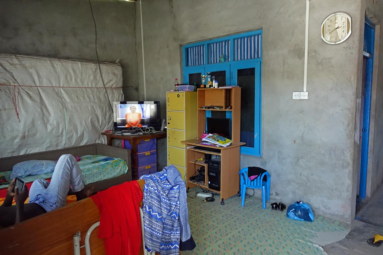Wir dürfen auch in die Mannschaftsunterkünfte und in deren Küchen- und Aufenthaltsbereiche schauen. Von der Sauberkeit und Organisation sind wir sehr beeindruckt; man merkt auch irgendwie, dass das Resort in Schweizer Hand ist und von einem deutschen Manager geleitet wird. Leider ist es bei dem Rundgang sehr heiß, weil in der Mitte der Insel kein Lüftchen weht - wir flüchten uns überall sofort in den Schatten.