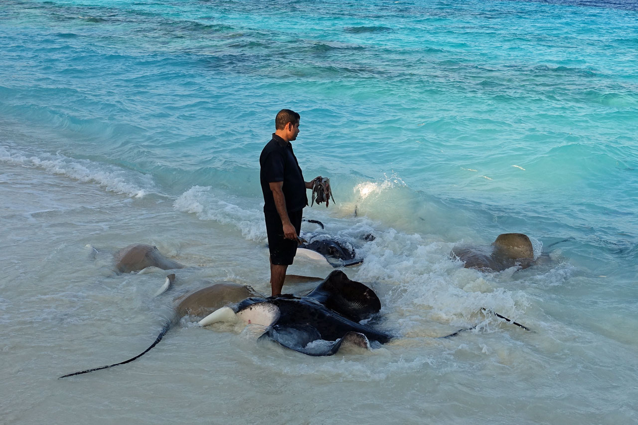 schwarze und braune Mantas sowie einige Stachelrochen dabei. Viele