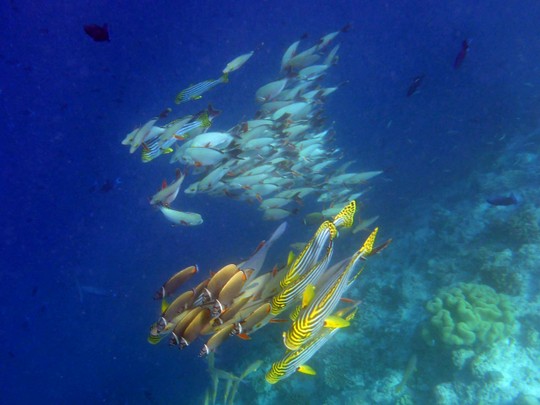 Wer also auf die Malediven fahren will, um zu schnorcheln, wählt besser eine andere Insel, denn interessante oder aufregende Fischbeobachtungen kommen nur dann zustande, wenn man an einer der Fahrten teilnimmt, die vom "Sea-Explorer" angeboten werden. Diese führen zu verschiedenen Riffen in der Umgebung und müssen teuer bezahlt werden. Wer aber bereit ist, für jede Schnorcheltour 50 Dollar auszugeben, dem kann ich Reethi Beach durchaus empfehlen, denn mich haben die Preise erst einmal abgeschreckt: Dazu kommen noch 23,2% für Steuern und Service! Dive-Spots gibt es genug: 80 Tauchgründe in einer Entfernung von 10 bis 70 Minuten mit dem Boot. Wer Spaß daran hat, kann hier viel Geld loswerden. Andererseits kostet eine solche komfortable Schnorcheltour nicht mehr als 10 Glas Bier - und so gesehen, ist das gar nicht mal so teuer.
