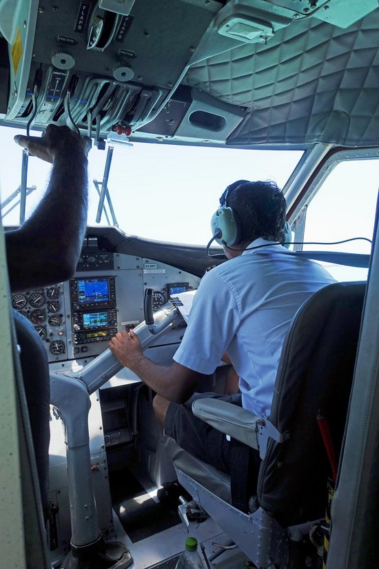 Nach einer Weile startet endlich mit ohrenbetäubendem Lärm unser Wasserflugzeug. Die beiden Piloten fliegen mit offenem Fenster und nackten Füßen. Zwölf Fluggäste sitzen in der kleinen Maschine und unsere Koffer liegen hinter den letzten beiden Reihen. Unser Flug soll 35 Minuten dauern und wir sind froh, dass wir den Wasserflugzeugtransfer gewählt haben. Es herrscht zwar eine hohe Temperatur im Innenraum und die beiden laut surrenden Ventilatoren kühlen nur wenig, aber der Flug über die Inselwelt ist wirklich wunderschön.