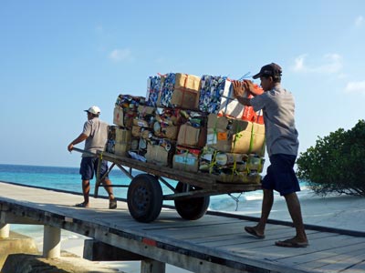 Nachmittags kommen viele neue Gäste an. Es ist unheimlich heiß und man kann es nicht am Strand aushalten. Wir flüchten uns unter den Schatten der Bäume. Meine Frau legt sich in den Liegestuhl auf der Terrasse, ich mache mir es mit Hilfe der Polsterauflagen auf der Hollywoodschaukel gemütlich. Bei meinem Rundgang über die Insel beobachte ich das Verladen der Lebensmittel, als am Schiffsanleger die Dhonis mit dem Nachschub ankommen. Aber auch der Abtransport des Mülls ist ein Problem. Jeden Nachmittag müssen drei Karren davon auf das Schiff geladen werden. Der gesamte Müll wird auf die Insel Thilafushi gebracht und dort verbrannt bzw. verkippt. Das sind pro Tag von allen Inseln zusammen insgesamt ca. 400 Tonnen.Davon wächst die Insel täglich um 1m² und ist inzwischen so groß geworden, dass man Fabriken und Industrie dort angesiedelt hat.