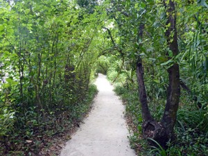Als wir um 8:00 Uhr aufstehen, regnet es, hört aber 5 Minuten später auf.Wir nehmen keinen Schirm mit zum Frühstück, weil das Blätterdach über den Wegen durch die Insel ziemlich dicht ist. Schmale Sandwege durchkreuzen die Insel. Als wir zur Beachvilla zurückkommen, wartet schon der Roomboy; er bekommt wieder 5 Dollar mit dem Hinweis, dass er uns nicht so viel Wasser bringen muss. Wir haben schon vier Literflaschen da stehen und trinken sie nicht, weil wir uns von der Strandbar immer Tonic, Bitter Lemon und Soda von Schweppes mitgenommen und in den Kühlschrank gestellt haben. Da haben wir jetzt unseren eigenen gut gekühlten Getränkevorrat.