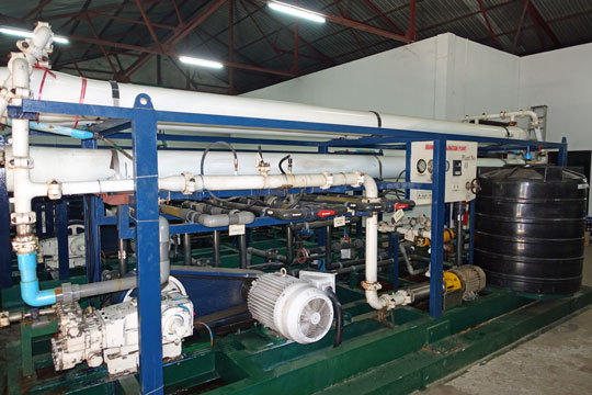Um 11:00 Uhr nehmen wir an der Führung durch die Anlage teil. 28 Personen haben sich in die Liste eingetragen, um einmal in diesem Resort hinter die Kulissen zu schauen. Das Angebot finden wir hervorragend, weil so wirklich alles transparent gemacht wird. Maria, eine der deutschen Gästebetreuerinnen, erklärt, dass zur Zeit die 260 Gäste im voll ausgebuchten Resort von fast 300 Beschäftigten versorgt werden. Mehr als die Hälfte kommt aus Bangladesh, der Rest zu gleichen Teilen aus Indien und Sri Lanka. Davon sind 25 Frauen. Alles ist hervorragend durchorganisiert: Wir besuchen die Küchen, die Bäckerei, die Wäscherei, verschiedene Werkstätten und schauen uns die Trinkwassergewinnungsanlage an. Hier wird sogar mit Zusatz von Carbonaten ein eigenes Mineralwasser hergestellt.