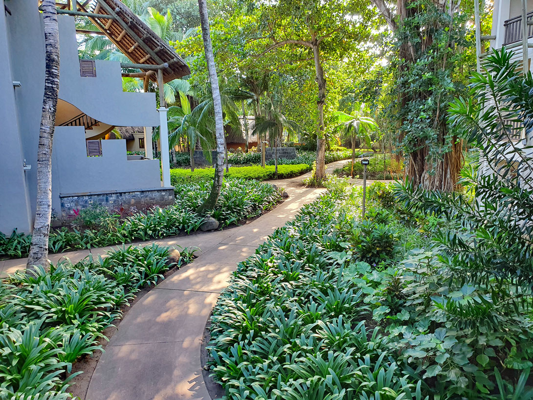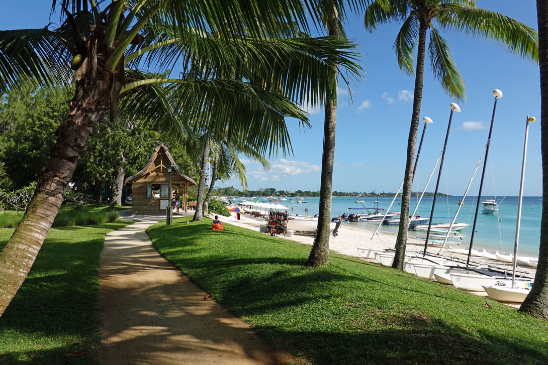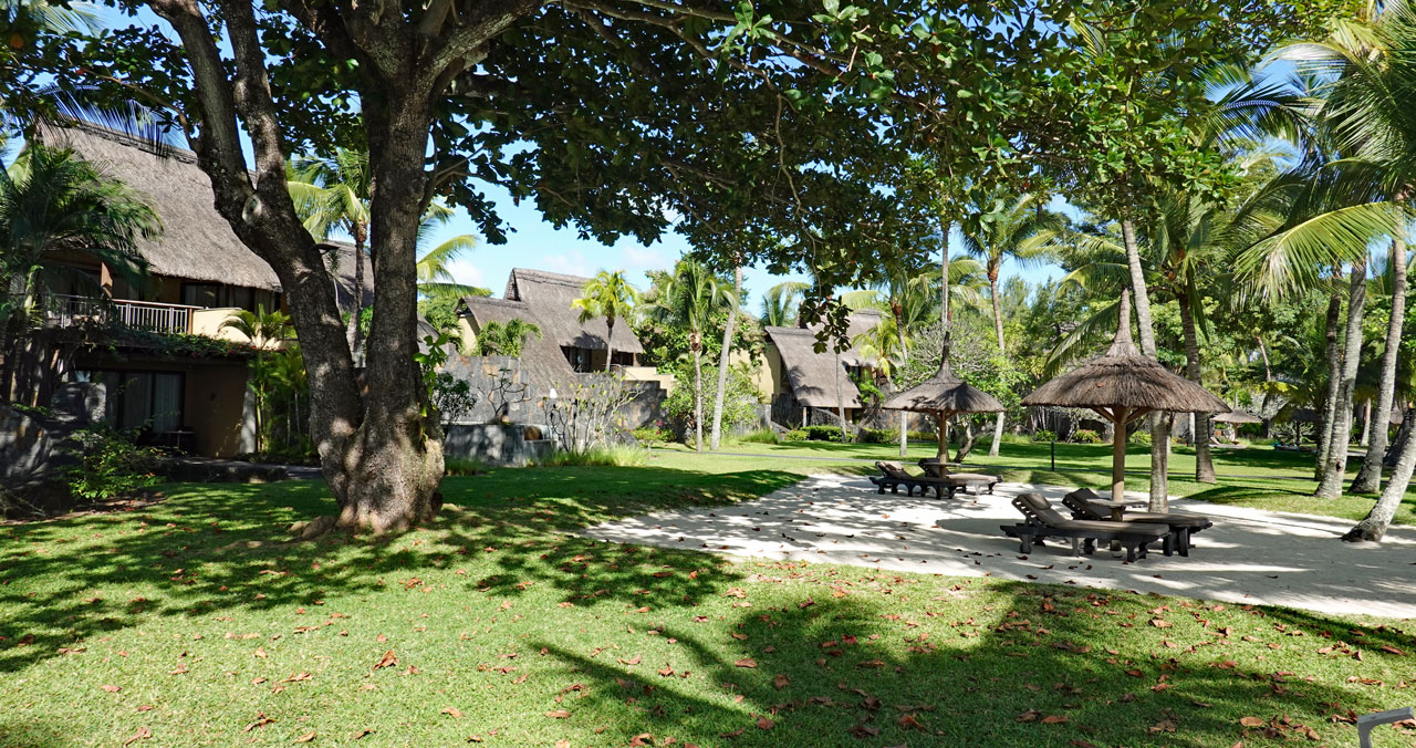 Direkt neben dem öffentlichen Strand beginnt der Strand des Beachcomber Resorts Trou aux Biches. Das kann man an den Liegen und den grünen Handtüchern erkennen, die die Hotelgäste mitbringen. Wir spazieren einmal durch den Hotelgarten und schauen uns von dort den Strand an. Hier unsere Eindrücke: