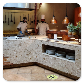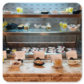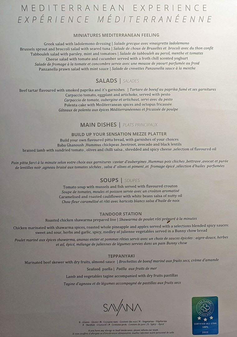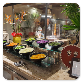 Überrascht sind wir von dem gut organisierten Frühstücksbüffet, denn ein Teil ist einem klimatisierten Bereich hinter einer Schiebetür untergebracht, während sich die 3 Kochstationen und die Warmhalteplatten im Nebenraum befinden. Kaffee und Cappuccino werden gebracht und das Servicepersonal ist sehr freundlich und anschließend schnell beim Abräumen.
