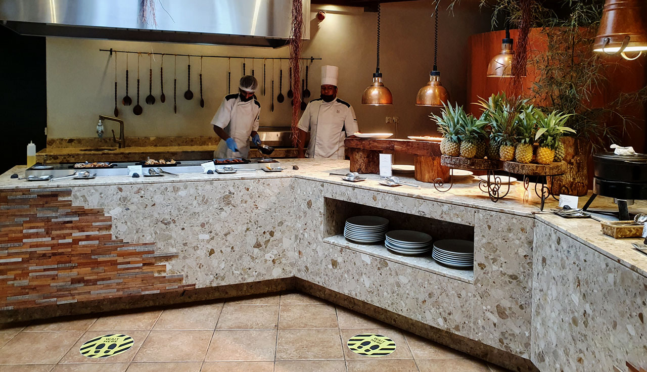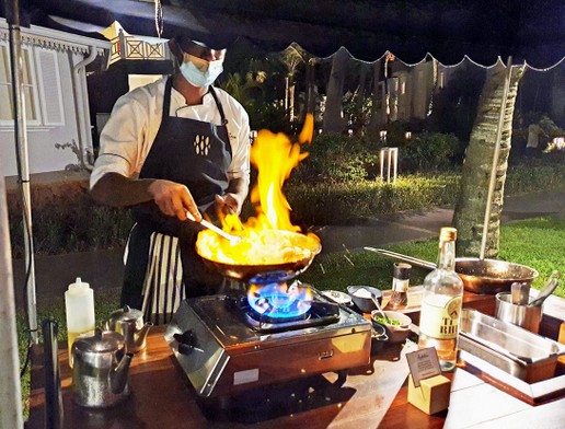 Am Abend ist eine geschlossene Veranstaltung im Heritage Awali und wir haben stattdessen einen Tisch im Restaurant Annabelle des Telfair Hotels reserviert. Dort wird ein ordentliches Fischbüffet angeboten, obwohl der Gebläsekrach im offenen Küchenbereich unerträglich ist. Draußen auf dem Grill werden Shrimps mit Rum flambiert
