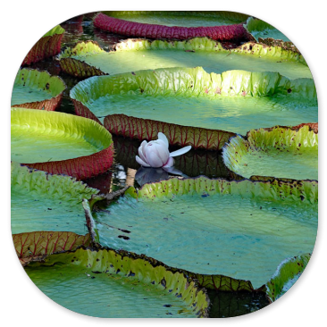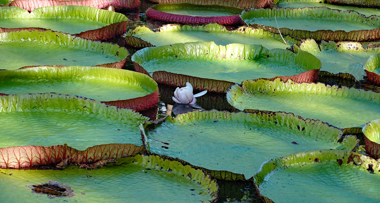Von diesen Amazonas Seerosen gibt es nur zwei Arten und sie heißen so, weil sie ursprünglich nur dort existierten. Sie sehen wunderschön aus mit ihren riesigen Blättern, die bis zu 60kg tragen können. Sie haben 6-7m lange Stiele und öffnen ihre Blüten nur in der Nacht. Die Bestäubung erfolgt durch Käfer, die in der ersten Nacht in die offenen Blüten krabbeln, am darauffolgenden Tag in der geschlossenen Blüte gefangen bleiben und erst in der zweiten Nacht wieder freigelassen werden. Während die Blüten tagsüber geschlossen sind, wechseln sie ihre Farbe von weiß in der ersten Nacht zu einem dunklen purpur-rot in der zweiten Nacht.