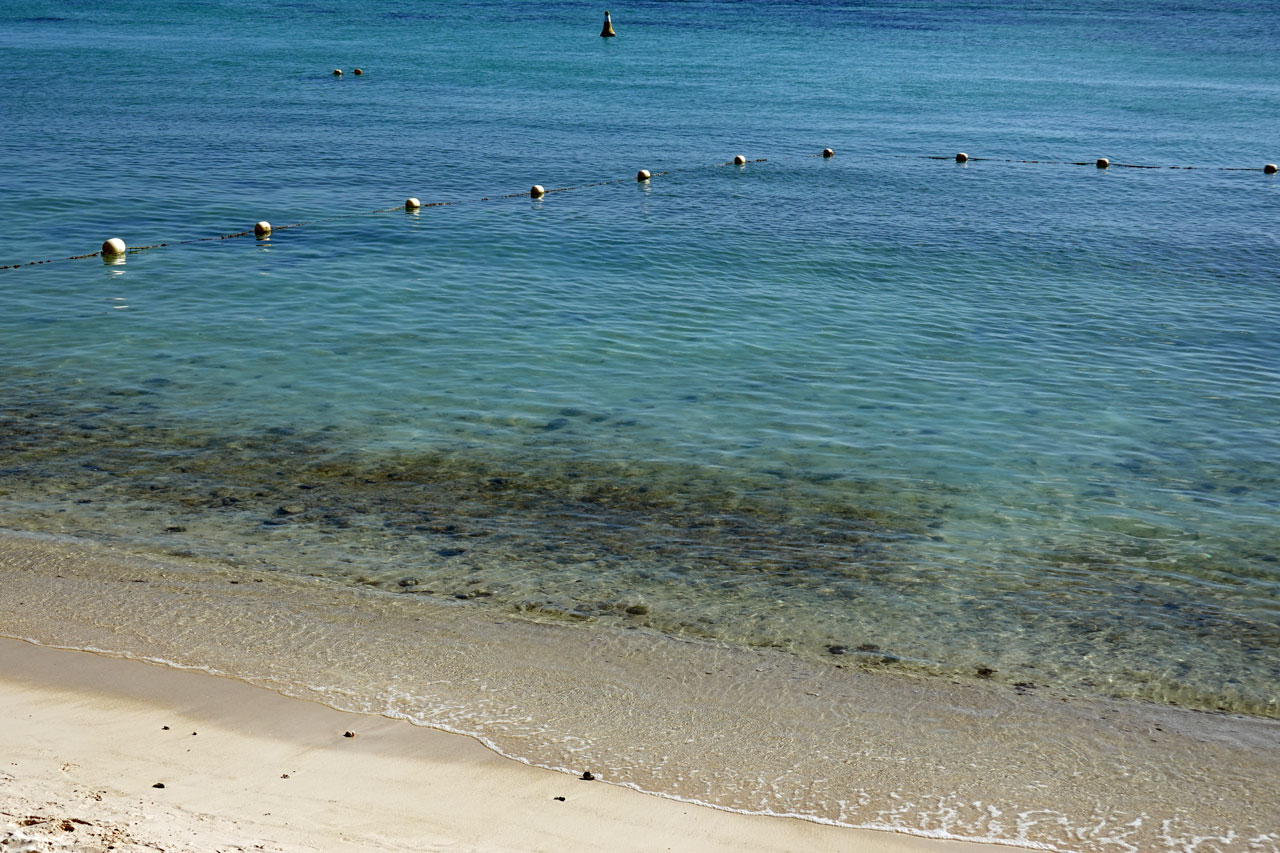 Als wir uns die Lagune etwas näher anschauen, stellen wir fest, dass sie doch schöner ist als am Heritage Awali, weil sie größer und langgestreckter ist. Es ist auch keine so starke Strömung vorhanden. Das flache Wasser und die Korallenreste darin sind aber gleich. Die abgesteckten Schwimmzonen sind ebenfalls klein und davor sausen die Speedboote entlang.