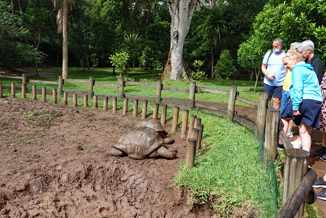 Es gibt in dem Park auch einen Garten mit Riesenschildkröten, die man von den Seychellen hierhin gebracht hat. Ähnlich wie im Pamplemousse Botanical Garden im Norden von Mauritius sollen sie als Touristenattraktion dienen.