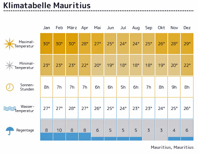 Der Zufall kam uns zu Hilfe, weil uns im November 2021 die Lufthansa einen Schnäppchen-Flug in der Business-Class nach Mauritius anbot, den wir uns nicht entgehen lassen wollten und sofort annahmen. Das Awali Heritage Resort ergänzte das wunderbar durch ein supergünstiges All-Inclusive-Angebot für den Frühling 2022. Als wir die Reisekataloge durchblätterten und die Beschreibung von dem großzügig renovierten 5-Sterne Resort sahen, waren wir ganz begeistert. Die Gegend von Bel Ombre kannten wir überhaupt nicht, weil wir bei unserem ersten Besuch nicht im Süden der Insel gewesen waren. Wohl war uns der berühmte Berg Le Morne bekannt, der ganz in der Nähe ist. Die Internetseite des Hotels ist toll und die 15-seitige Broschüre auch, die man sich dort herunterladen kann. Aktuelle Bewertungen fanden wir keine, weil durch die Corona-Pandemie 2020 und 2021 so gut wie keine Besucher dort waren, zumal die Regierung auch zeitweise den Besuch der Insel für Touristen gesperrt hatte. Dadurch war natürlich auch das Awali Heritage Resort geschlossen.Ich schaute mir die Klimatabellen von Mauritius an, um einen günstigen Termin zu finden. Die nebenstehende Tabelle stammt von der Webseite reiseklima.de und zeigt, dass man am besten im September und Oktober auf die Insel reist. Dann ist es nämlich Frühling in Mauritius, die Temperaturen sind nicht so hoch und nachts kühlt es ab, sodass man ohne Klimaanlage auskommt. In dieser Zeit regnet es kaum und die Wassertemperatur ist sowieso das ganze Jahr über angenehm.
