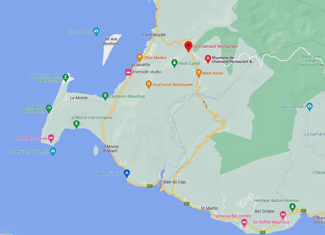 Um nach Le Morne zu kommen, müssen wir leider erst wieder zurück nach Baie du Cap, weil die Straße nach Case Noyale wegen eines Erdrutsches gesperrt ist. Der Vorschlag ist gut, denn als wir auf der Terrasse vom Chamarel Restaurant sitzen, lockert sich ein wenig der Himmel auf und wir können sehr gut die Ile aux Benitiers und den Felsen von Le Morne sehen.