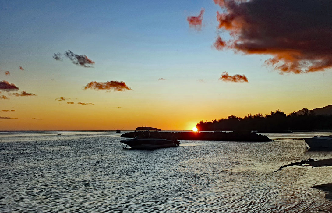 Von unserem Standpunkt aus versinkt zwar die Sonne nicht im Meer, sondern verschwindet hinter den Bäumen des öffentlichen Strandes von Bel Ombre, aber es entsteht eine tolle Abendstimmung.