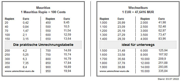 Im Shop muss ich sehr schnell erkennen, dass ich mich mit dem Umrechnungskurs anfreunden muss. Man kann zwar alles mit einer Kreditkarte bezahlen und braucht eigentlich gar kein Bargeld, aber es ist ganz nützlich, den Gegenwert in Euro zu wissen. Da wir aber in den nächsten Tagen auch einige Ausflüge machen wollen und auch etwas Trinkgeld für die Zimmermädchen oder Kellner haben wollen, wechsle ich an der Rezeption 100 Euro und bekomme dafür 3950 Rupien. Das ist ein miserabler Kurs . Demnach entspricht 1 Euro also 39,50 MUR. Wir merken uns, dass ein Euro etwa 40 Rupien sind, obwohl uns der Fahrer, der uns vom Flughafen hierher ins Hotel gefahren hat, von 45 Rupien als Gegenwert für einen Euro gesprochen hat. Er hat uns aber auch bestätigt, dass in Mauritius genau so gern amerikanische Dollars als Trinkgelder angenommen werden. Das tröstet uns, denn wir haben von zu Hause genügend viele 1-Dollar-Scheine mitgenommen, die wir immer üblicherweise als Trinkgeld weltweit verwenden. Dann haben wir immer noch eine Reserve, wenn uns die Rupies ausgehen.Als wir zum Strand gehen, tröpfelt es und während des Tages regnet es immer wieder. Wir sind froh, dass wir einen großen Schirm im Zimmer haben, unter dem wir trocken ins Restaurant kommen. Am Abend git es ein Mauritius-Themenbüffet mit vielen Spezialitäten, an die wir uns erst gewöhnen müssen, denn manche sind sehr scharf.