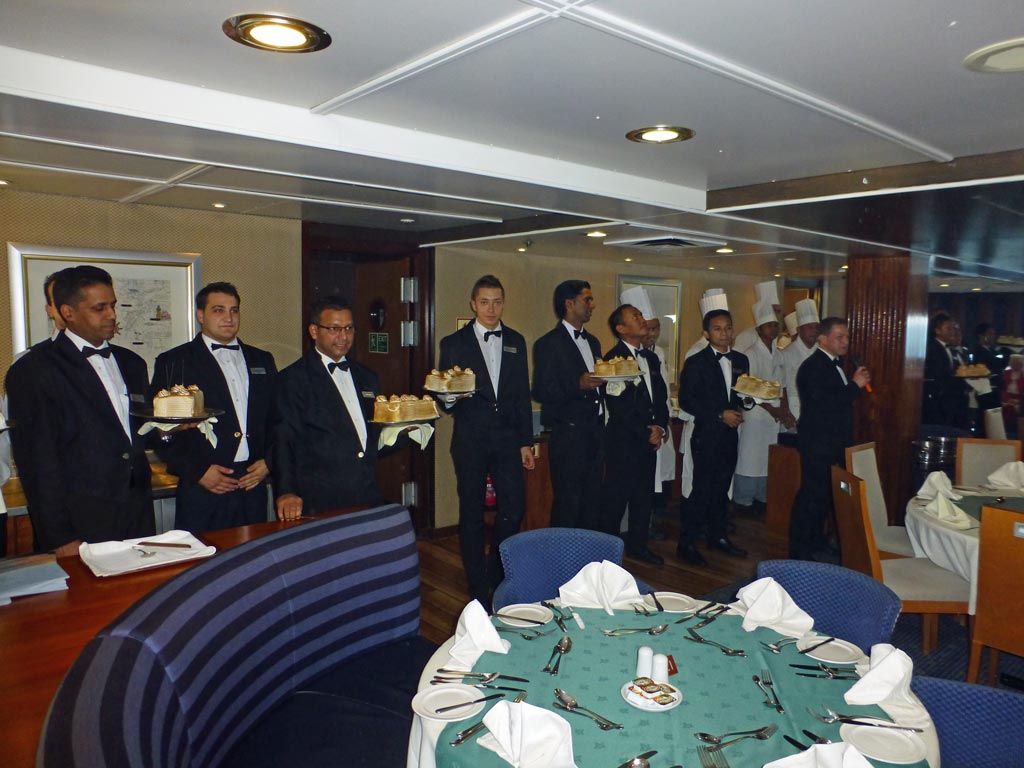 Für den Abend ist ein Gala-Abend mit Abschiedsessen in festlich eleganter Kleidung angekündigt worden. Im Hauptrestaurant gibt es ein Abschiedsmenü, das sehr ordentlich ist: Als Vorspeise wird Lachs mit Honig-Senf-Soße auf Toast serviert, danach eine Tomaten - Consommé; den Anschluss bildet ein sehr schmackhaftes Ragout Fin mit Fenchel und Kartoffelmousse. Als Hauptgang kann man zwischen Grouper und Schweinelendchen wählen. Beides schmeckt uns und unseren Tischnachbarn ausgezeichnet.