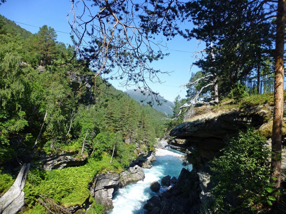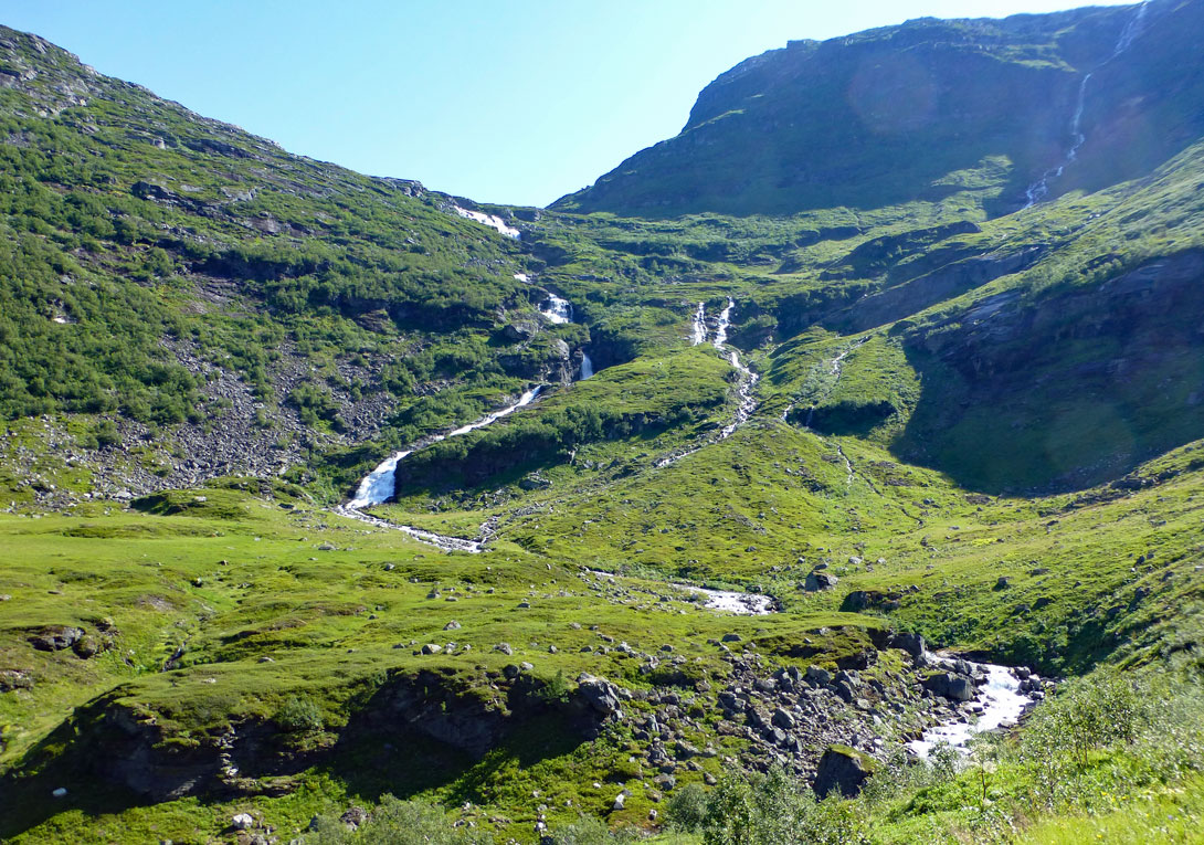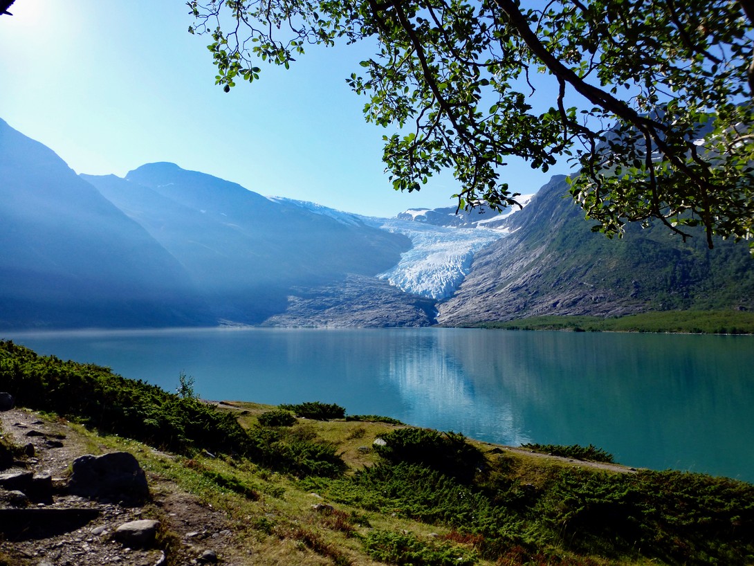 Von dort führt ein Wanderweg zum Gletschersee. Den spazieren wir entlang zum Gletscher. Die Landschaft ist wunderschön und genau so, wie wir uns Norwegen vorgestellt haben. Wir machen viele Fotos und genießen den Vormittag in der sonnig grünen Umgebung mit herrlich sauberer Luft.