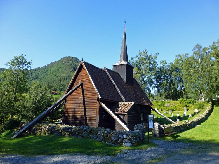 Unser erstes Ziel ist die Stabskirche in Rødven. Dazu fahren wir um den Isfjord herum bis zum Rødvenfjord. Auf dessen westlicher Seite liegt eine alte Holzkirche aus dem Jahre 1300. Es handelt sich um eine Kirche in Stabbauweise, das heißt, dass ihr Dach auf kräftigen Stäben ruht.