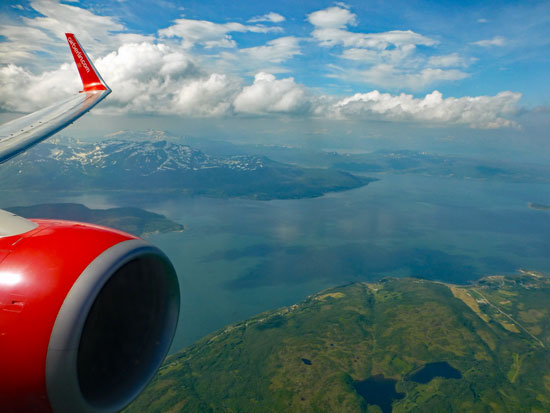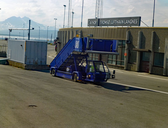 Dennoch genießen wir unseren Flug mit der Sondermaschine von FTI-Cruises und Air Berlin, die um 9:25 Uhr startet und drei Stunden später in Tromsø landet. Die Sonne scheint bei bewölktem Himmel und einer Temperatur von 15°C. Wir werden sofort vom Flugzeug zum Schiff gefahren - ohne Pass- und Zollkontrolle. Das erscheint uns sehr merkwürdig, denn wir hatten gehofft, am Flughafen ein paar Euros in norwegische Kronen eintauschen zu können. Schließlich braucht man in Norwegen norwegische Kronen, weil die Norweger den Euro strikt ablehnen.