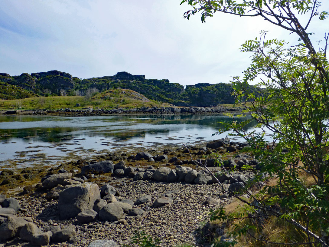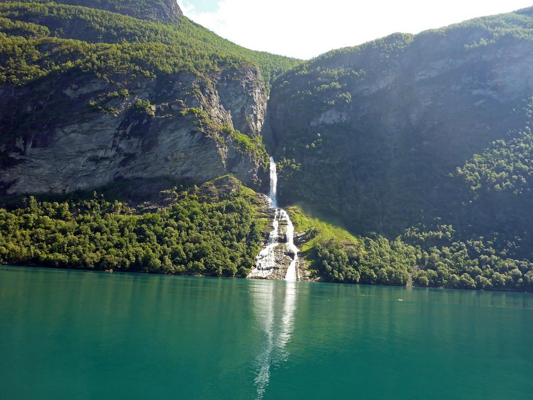 Das Ende des Fjords sieht sehr malerisch aus: Ein Wasserfall rieselt den grünen Hang herunter und die rotbraun glitzernden Granitfelsen steigen schroff an. Wir haben unwahrscheinliches Glück mit dem Wetter, denn die Sonne scheint und nur wenige Wolken ziehen über den blauen Himmel. Ein kräftiger Wind weht, wir können uns auf dem Boot in den Windschatten setzen und den Blick auf die wundervolle Landschaft genießen.