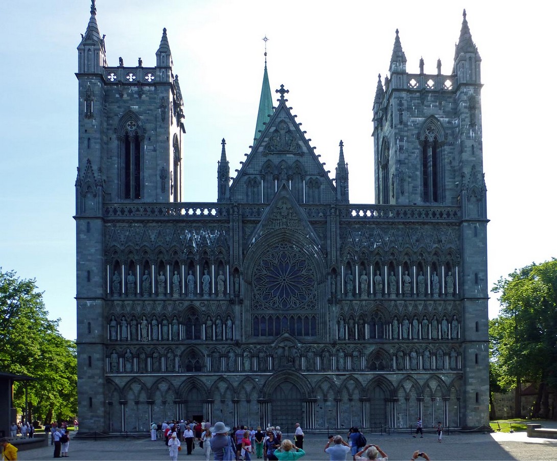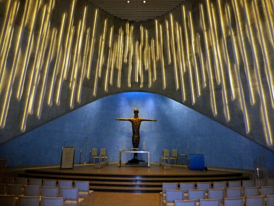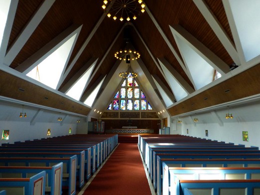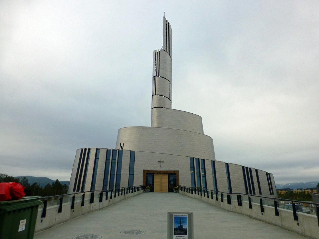Im Zentrum ist die Kirche mit den dreieckigen Formen sehr interessant, die ein Architekt aus Oslo entworfen hat. Im Innern der Kirche findet man viele dreieckige Formen in den bunten Glasfenstern wieder. Der Prospekt, der in der Kirche auch in deutscher Sprache ausliegt, erklärt, dass sich der Architekt durch die Trockengestelle für die Fische inspirieren ließ, die man überall entlang der norwegischen Küste findet. Außerdem ist das Dreieck ein Symbol für die heilige Dreifaltigkeit.