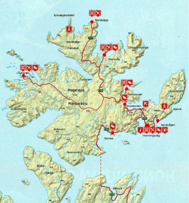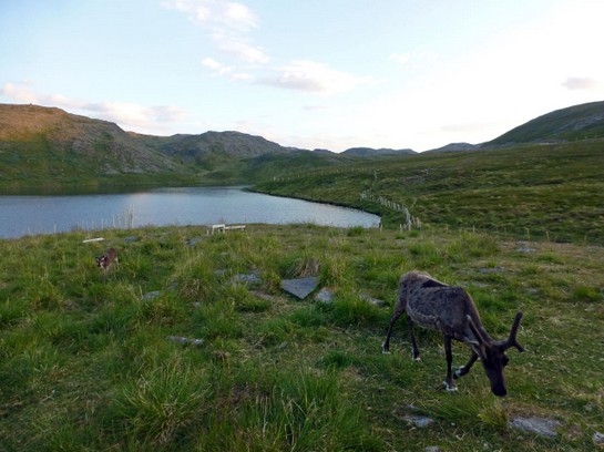 Das Nordkap liegt im Übrigen nicht auf dem Festland, sondern auf der Insel Magerøya Der Name bedeutet "magere Insel" und wurde von den Samen so benannt, die ihre Rentiere im Sommer dorthin trieben.Eigentlich ist dieser Ausflug mit 85 € ziemlich teuer, denn es sind ja nur 34 km bis zum Nordkap, aber die Fahrt mit dem öffentlichen Bus kostet auch schon 60 €. Den hätten wir schon nicht mehr bekommen, weil der letzte Bus am Tourismuscenter um 22:15 abfährt. Auch jetzt begegnen wir unterwegs Rentieren, die in der hellen Nacht hier weiden.