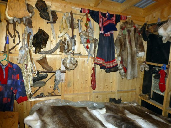 Nach einer halben Stunde machen wir eine Pause an einem Souvenirshop , das von der Ehefrau eines alten Samen geführt wird, der draußen in typischer Tracht neben einem Rentier für die Fotos der Kreuzfahrer posiert. In der Souvenirhütte kann man die Werkzeuge kaufen, die aus Rentiergeweihen hergestellt werden und zum Leben der Samen gehören. Es sind viele schöne Artikel angeboten und die Beiden machen sicher ein gutes Geschäft mit den sieben Bussen, die nacheinander hier ankommen und einen Stopp einlegen.