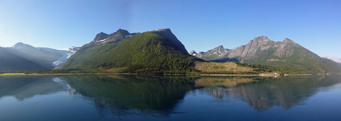Wir liegen in einem kleinen Ford vor dem Swartisen Gletscher, das Wasser ist völlig ruhig und der Gletscherarm im Hintergrund liegt noch im Schatten. Zwischen den grünen Berghängen und den Spiegelungen im Wasser ist die Gletscherzunge zu sehen. Das Wetter ist toll: Klarer Himmel und 18° C Lufttemperatur. In der Sonne sind es schon 23°C.