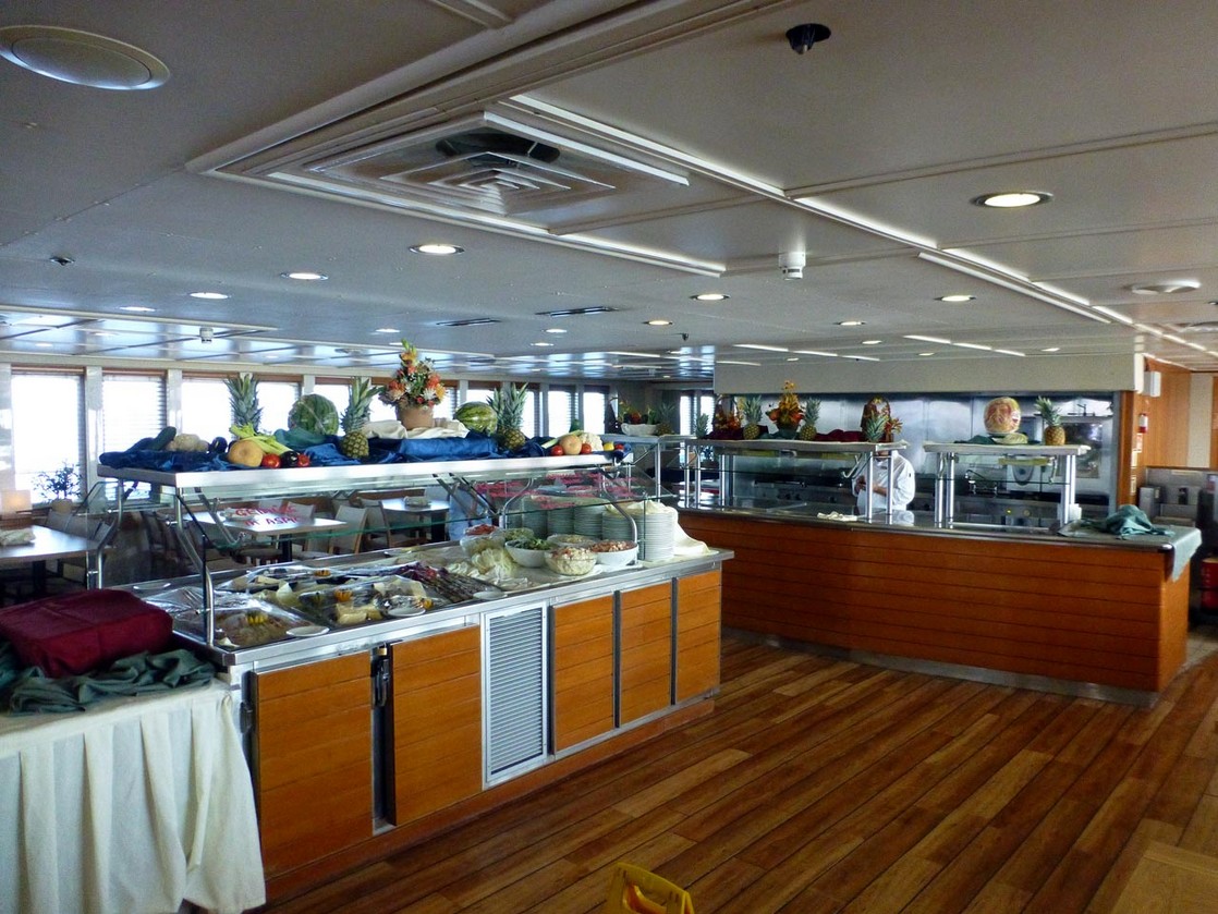 Den Abend genießen die meisten Passagiere mit romantischen Klaviermelodien im Yacht Club oder Tanzmusik in der Scirocco Lounge, wo es ab 23:00 Uhr wieder eine Happy Hour mit halben Preisen gibt. Cocktail des Tages ist "summer breeze", eine Mischung aus dunklem Rum, Pfirsich, Blue Curaçao und Ananassaft. Erstaunlich ist, wie viele Passagiere noch am Abend bzw. in der Nacht Hunger haben und das Mitternachtsbüffet im Verandah-Restaurant wahrnehmen, das täglich von 22:30 - 23:30 Uhr angeboten wird. Ich muss allerdings gestehen, dass ich mir oft um diese Zeit dort noch ein Bier vom Fass habe zapfen lassen, das doch wesentlich besser schmeckt als das Bier aus der Dose in der Minibar.