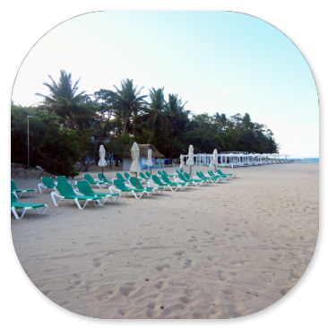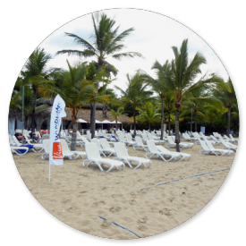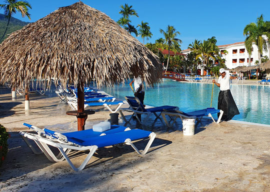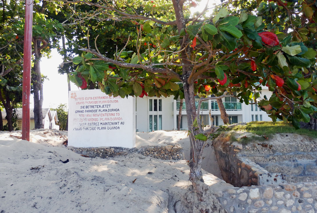 Die große Costa Dorada-Bucht ist hier zu Ende, denn das Be Live Collection Marién liegt am westlichen Ende der Bucht. Zu meckern gibt es nichts und wir sind zunächst begeistert, denn das Wasser ist sauber und es sind kaum Wellen vorhanden, weil etwa 200m vor der Bucht ein kleines Riff liegt. Außerdem ist das Meer wunderbar warm und der feinsandige Strand fällt flach ab, ohne Steine und Korallen. Das ist ideal zum Schwimmen. Inzwischen stellt sich bei uns eine gewisse Ferienlaune ein und wir freuen uns auf die nächsten drei Wochen. Die Duschen am Strand funktionieren nicht richtig und könnten besser sein, aber das ist halt in der Karibik so. Die Handtücher können wir leider nicht wie die anderen Hotelgäste am Activity Center umtauschen, weil wir größere VIP-Strand-Badetücher mit weiß-blauen Streifen haben, die uns als VIP-Gäste ausweisen. Wir müssen in der VIP-Lounge Bescheid sagen, damit sie täglich zusammen mit den Handtüchern im Zimmer gewechselt werden.