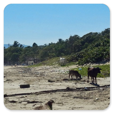 Wenn man sich dem Dorf nähert, kommen sofort die Verkäufer der kleinen Boutiquen und wollen die Touristen zu den Souvenirshops locken. Als mich ein Verkäufer anspricht, frage ich ihn, warum es das Dorf zulässt, dass der ganze Müll in den Bach geworfen und dann ins Meer gespült wird.