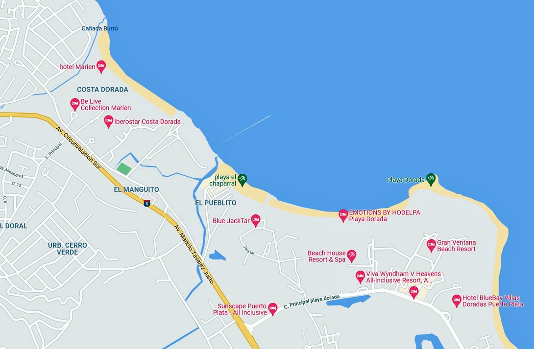 Auf dem Bild ist das Sunscape Hotel in der Mitte mit den grünen Dächern zu sehen; daneben rechts mit den roten Dächern liegt das Gran Ventana. Auf dem Foto kann man rechts auch die weißen Dächer des Grand Paradise Hotels entdecken und rechts oben dahinter auch noch ein kleines Stück des Strandes vor dem Emotions Resort.