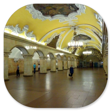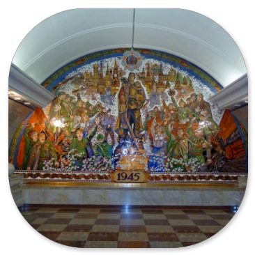 Von der Station Park Probedy fahren wir erst einmal mit der längsten Rolltreppe der Welt (147 m) etwa 80 m in die Tiefe und staunen unten über die blitzsauberen Gänge und die Gemälde an den Stirnseiten und Seitenwänden mit den vielen Durchgängen. Überall werden bestimmte Themenbereiche oder geschichtliche Ereignisse künstlerisch dargestellt. Alle 40 Sekunden kommt eine U-bahn und Tausende von Menschen wechseln in kürzester Zeit die Bahn. Es ist schon fantastisch. 9 Millionen Fahrgäste befördert die Metro jeden Tag. An der nächsten Station Kiewskaja sieht alles ganz anders aus: Hier sind die Wände mit Mosaiken gestaltet und in der nächsten Station wieder ganz anders. Hier sind jetzt überall Skulpturen an den Eingängen, die den russischen Arbeitern gewidmet sind. Manche Stationen sehen aus wie italienische Kirchen; andere wiederum haben bemalte Kirchenfenster, die von hinten beleuchtet werden. Hier eine kleine Fotostrecke davon: