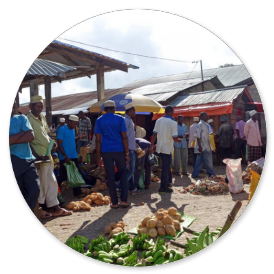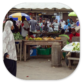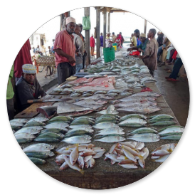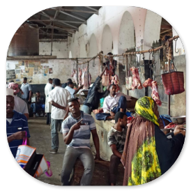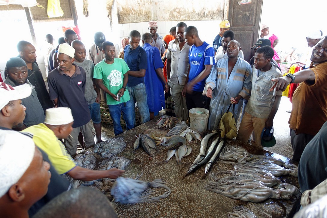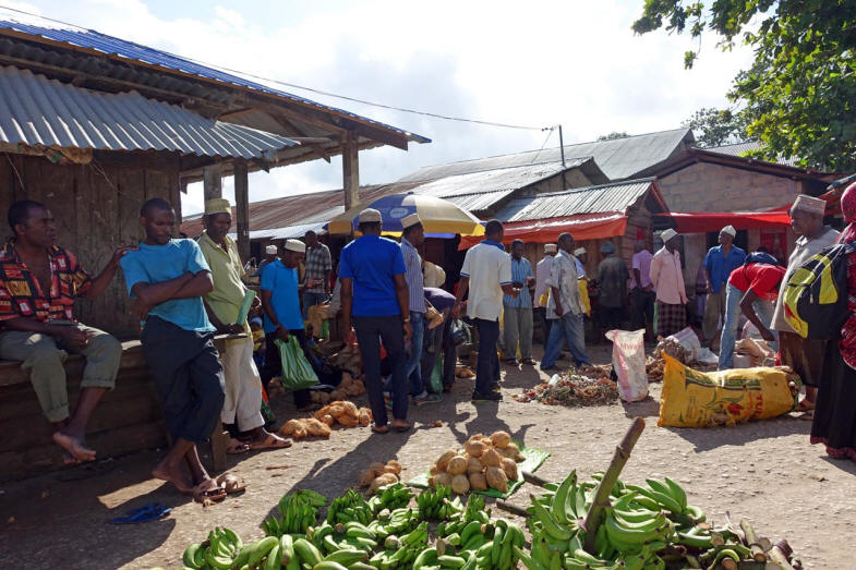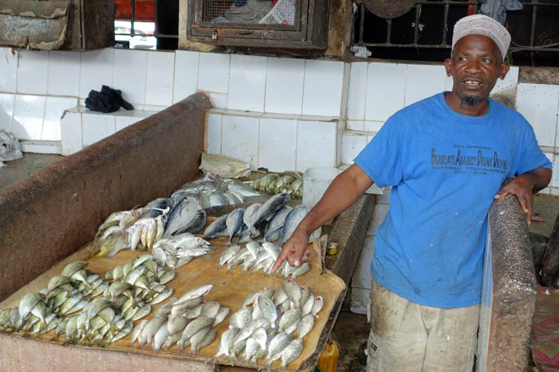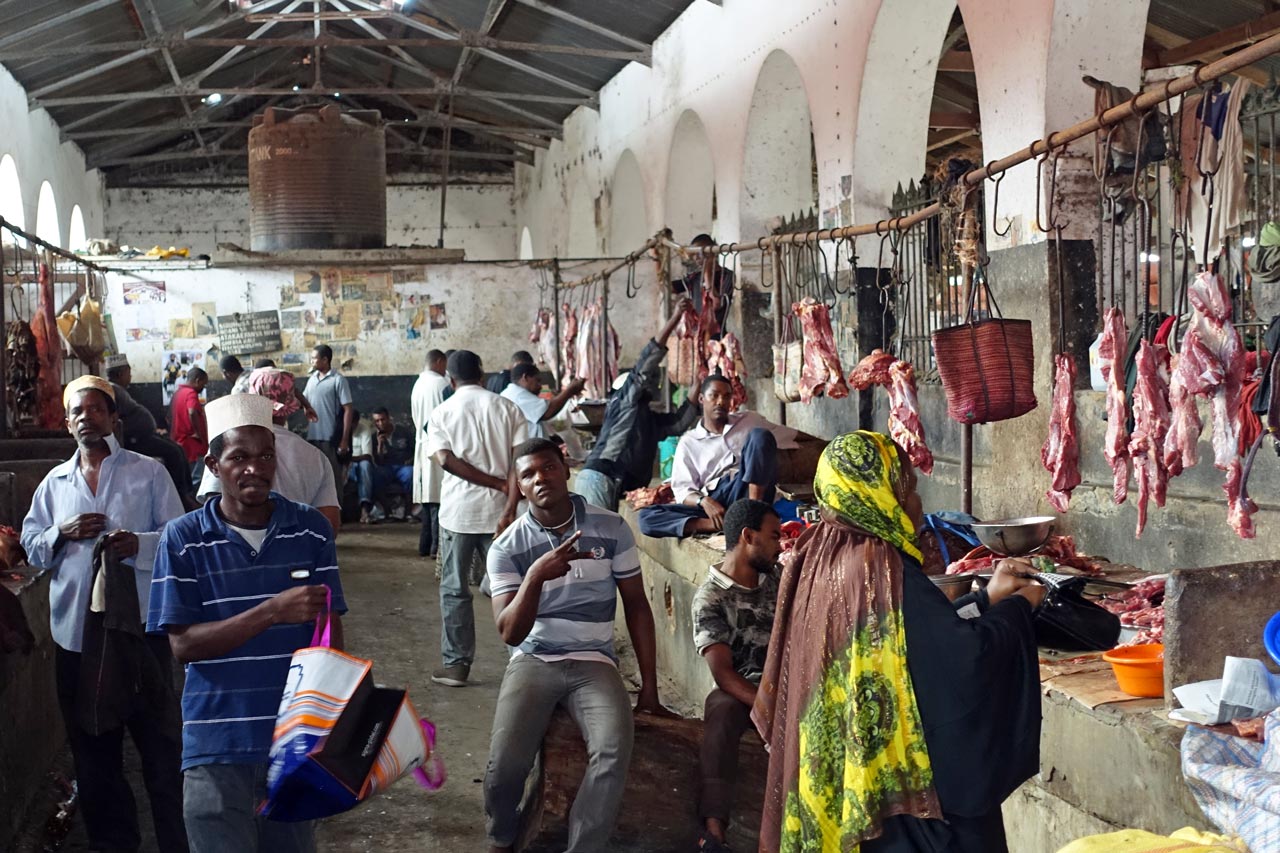 Eine Stunde später sind wir in Stonetown und spazieren über den Markt. Auf der einen Seite der Markthalle werden die Fische an die Händler versteigert, die sie 20 m weiter in der Halle an die Kunden verkaufen.