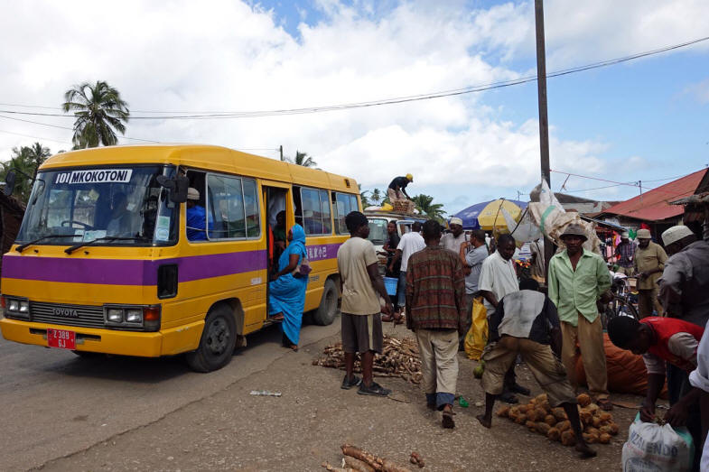 Das erleben wir dann eine dreiviertel Stunde später in dem Ort Mkokotoni. Offiziell dürfen 23 Fahrgäste in den Minibus einsteigen, in Wirklichkeit sind es immer mehr. Allerdings stehen an der Landstraße oft Polizeiposten, die die Busse anhalten und das kontrollieren. Viele Sansibari fahren aber nicht mit den Linienbussen, sondern mit einem "Daladala", das ist ein Sammelbus, wie er in vielen orientalischen Ländern gebräuchlich ist. Er fährt eben nur ab, wenn sich genug Fahrgäste eingefunden haben und hält immer dort, wo ein Fahrgast aussteigen will. Der Schaffner steht hinten auf der Plattform.