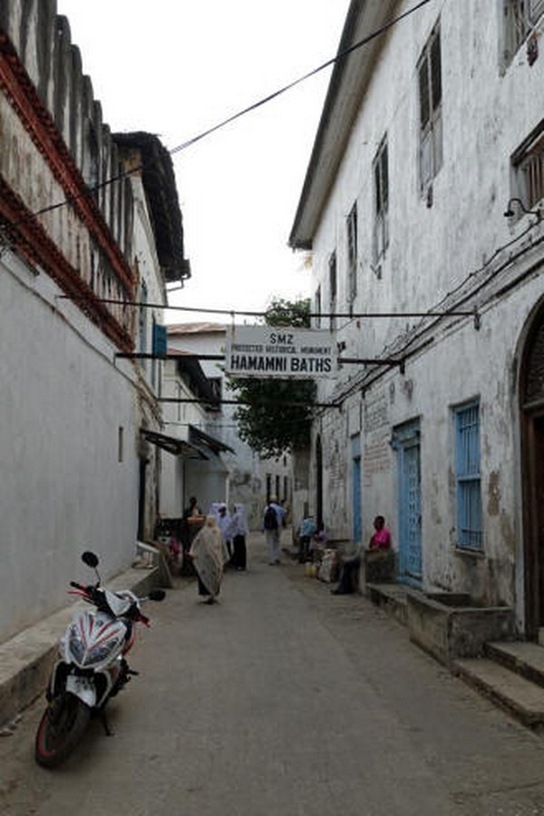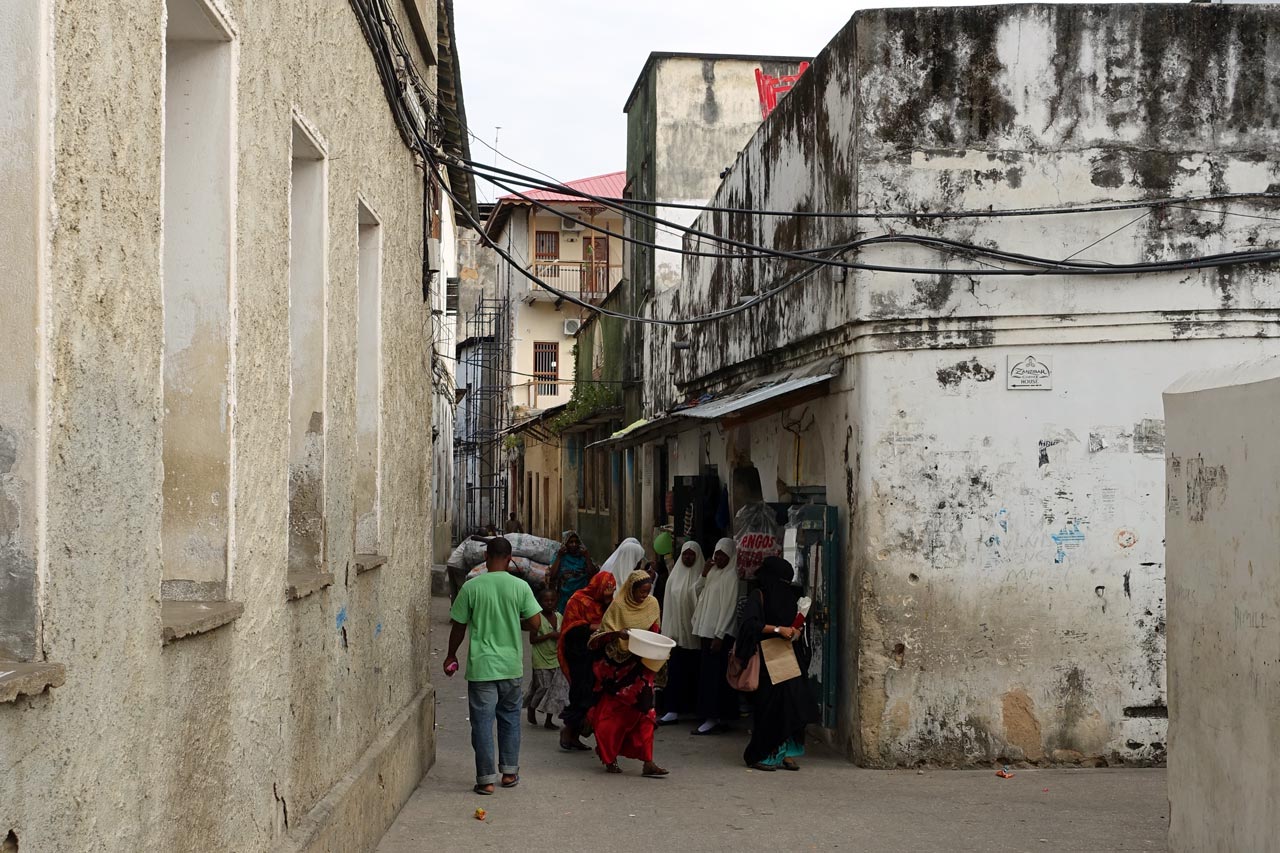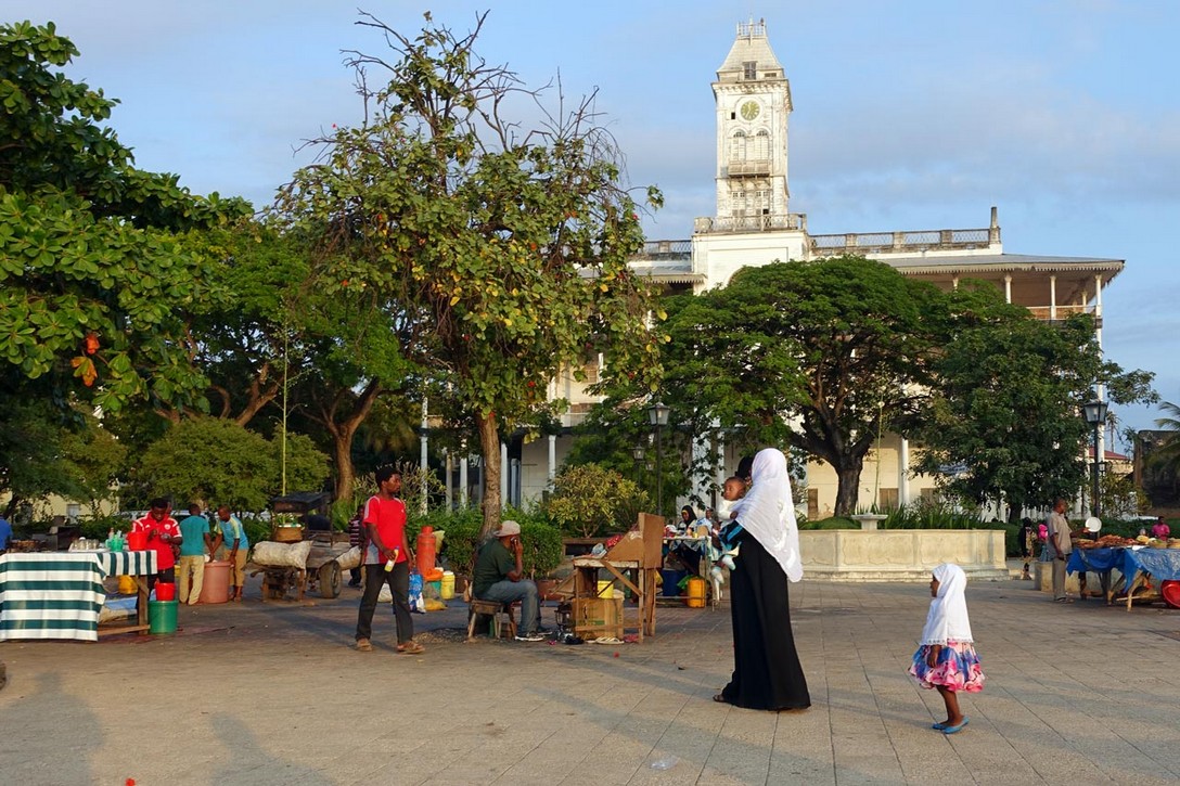 Die Hauptstadt von Sansibar hat 250 000 Einwohner und hat ihren Namen dadurch, dass hier im 19. Jahrhundert schon sehr viele Häuser aus Korallen- Kalkstein gebaut wurde. Als wir durch den Stadtteil Michenzani fahren, weist uns unser Guide auf die Häuser hin, die von deutschen Architekten gebaut wurden. Wir sind sehr erstaunt über diese grauen Steinkästen und können es gar nicht glauben. Aber es waren in der Tat Architekten aus der ehemaligen DDR, die in den 70er Jahren solche Plattenbauten hier erstellten. Ein Stück weiter halten wir am ehemaligen Sklavenmarkt und gehen von dort aus weiter zu Fuß durch die Altstadt.