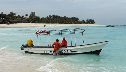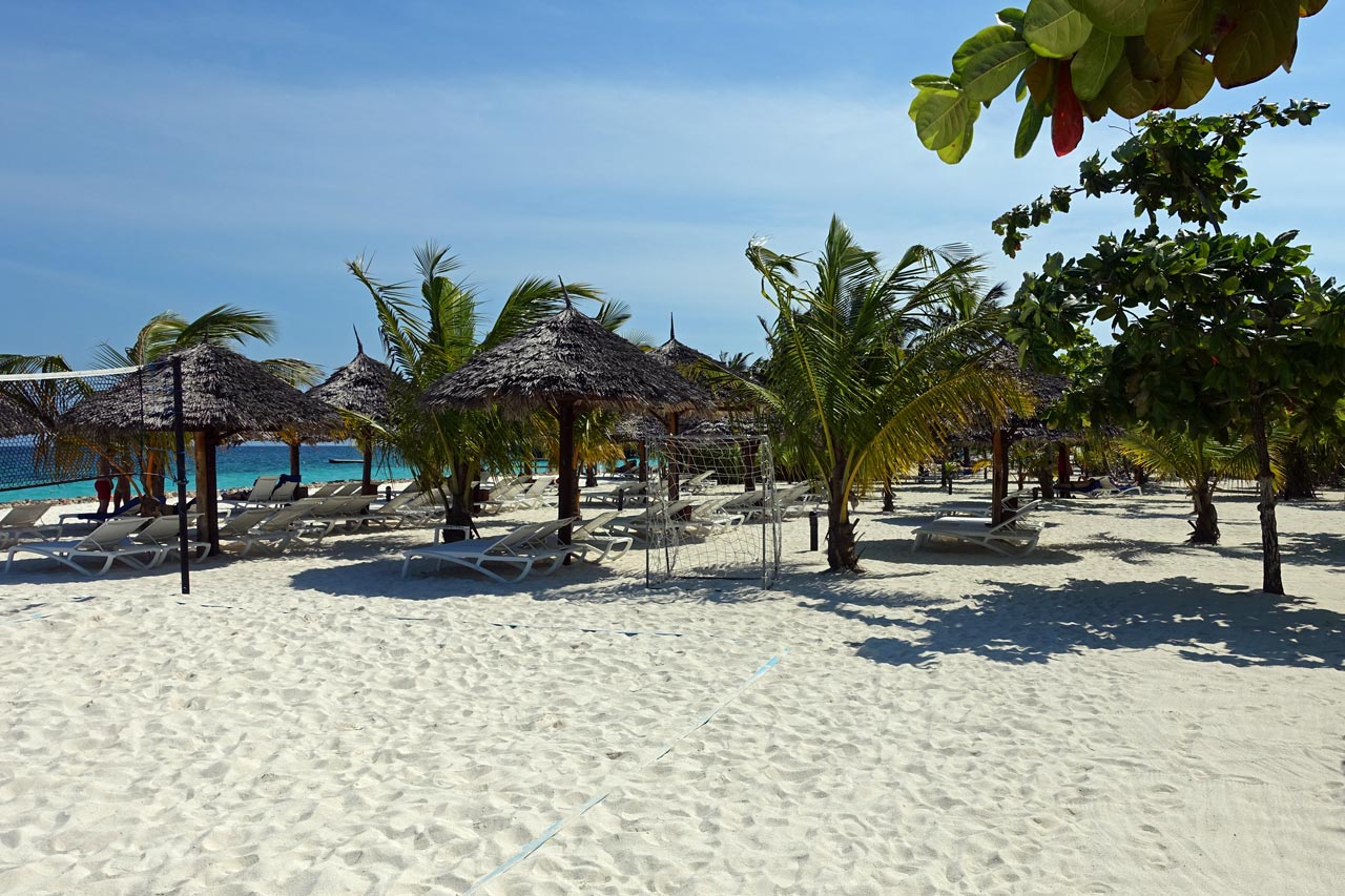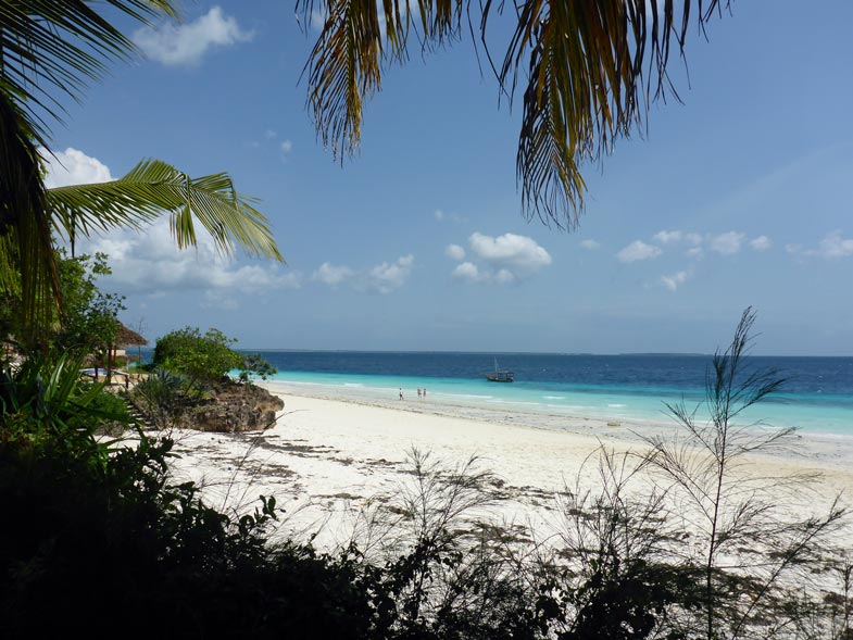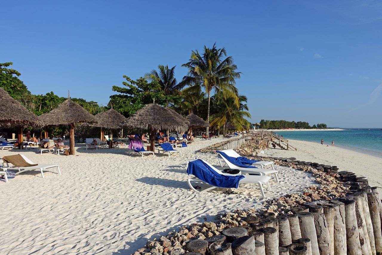 Alles ist sauber und ordentlich; wir sind zufrieden, räumen unsere Sachen ein und legen uns erst einmal auf eine Liege am Strand. Der Himmel ist blau mit ein paar leichten Wölkchen. Dazu weht ein leichter Wind und freie Liegen gibt es genug in der Anlage. Der Sand ist fast weiß und fein wie Puderzucker. Das Meer ist türkisgrün und sauber bis auf ein paar kleine Seegrasbrocken, die darauf schwimmen. Unter den Palmen und Sonnendächern gibt es genug schattige Plätzchen, sodass die Temperatur sehr angenehm ist. Wir merken, dass wir in der Nacht nur wenig geschlafen haben und holen einiges nach. Gegen Mittag meldet sich der leere Magen und wir essen einen Happen im Strandrestaurant. Kellner und Angestellte sind äußerst freundlich. Alle werden mit "Jambo" begrüßt und wir lernen die beiden wichtigsten Ausdrücke für einen Strandurlaub auf Sansibar: "Pole pole" = Immer mit der Ruhe! und "Hakuna matata" = Kein Problem!