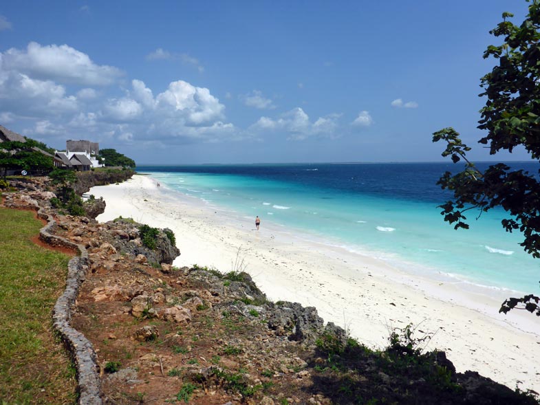 Ein wunderschöner blauer Himmel begrüßt uns beim Aufstehen. Das Frühstücksbüffet ist gut besucht und sehr ordentlich. Ein frischer Wind durchzieht das große runde Restaurant und bestätigt uns, dass Juni und Juli die beste Reisezeit für Sansibar sind. Inzwischen hat Twiwalu unser Zimmer in Arbeit und schön hergerichtet. Frische Blüten von Bougainvilleas und Frangipanis schmücken unser Bett. Wir besuchen die Boutique und staunen über die Fantasiepreise, die für die Souvenirs und die Badesachen verlangt werden.