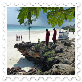 Es ist ein heißer Tag und wir müssen unsere Liegen immer weiter in den Schatten rücken. Ich setze mich auf eine Klippe am Strand und fotografiere die "Plastik-Massai", wie sie von den Einheimischen genannt werden. Manche sind echte Massai, andere haben sich als Massai-Krieger verkleidet und bilden mit ihren farbenfrohen Kostümen exotische Fotoobjekte für die Touristen. Besonders die italienischen Touristinnen sind lockende Ziele, die sie bei ihren Spaziergängen ansprechen und dann begleiten. Inzwischen sprechen viele von ihnen recht gut italienisch.