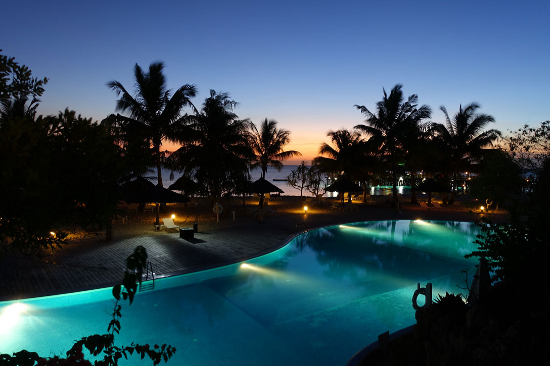 Heute sieht es nicht so gut aus mit dem Wetter. Bis zum Mittag regnet es. Erst am Nachmittag klart es etwas auf und es ist ziemlich kühl - wenn man bei 24°C diesen Ausdruck verwenden will. Am Abend ist der Himmel wieder wolkenlos und klar. Wir fotografieren nach dem Sonnenuntergang die beleuchtete Anlage mit dem Pool und der Sunsetbar.