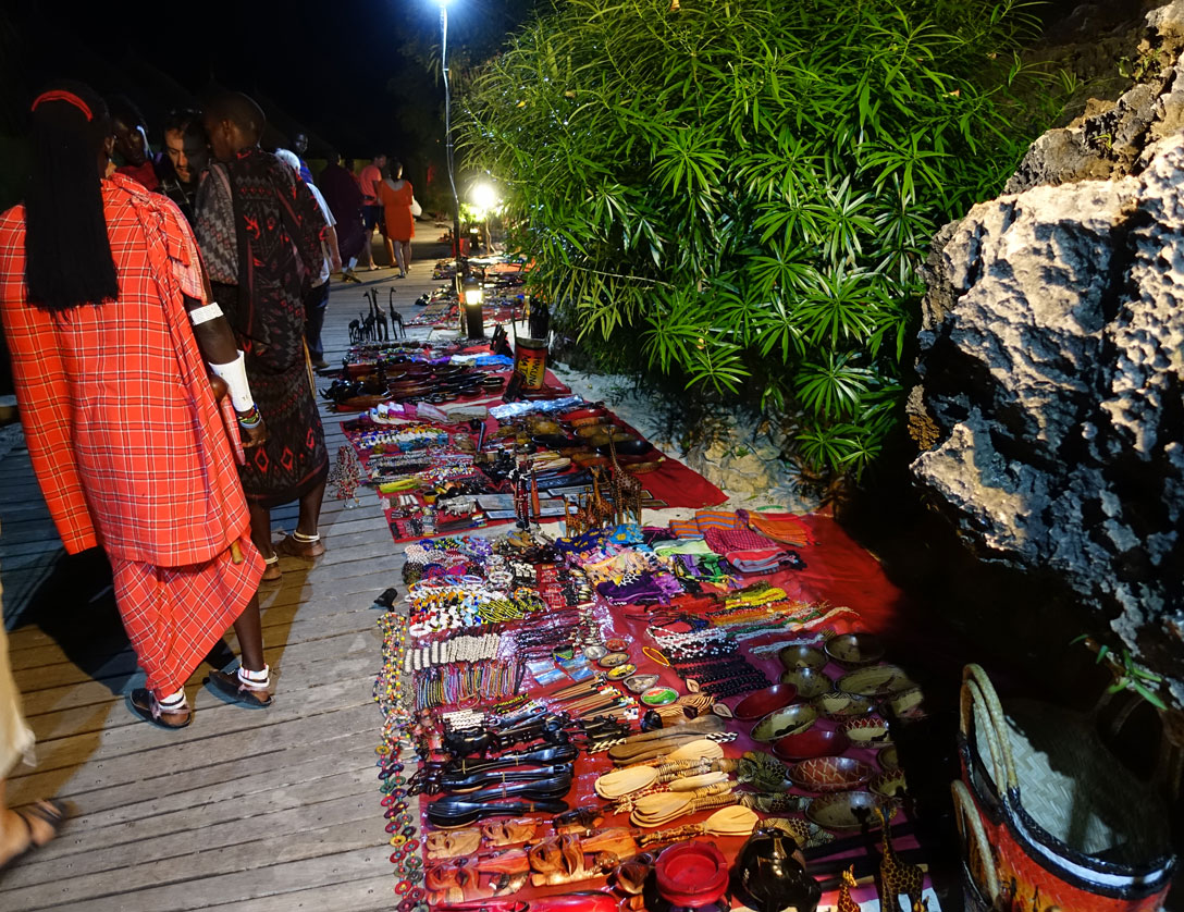Die Massai haben ihre Schnitzereien und Kunsthandwerke zum Verkauf ausgelegt.