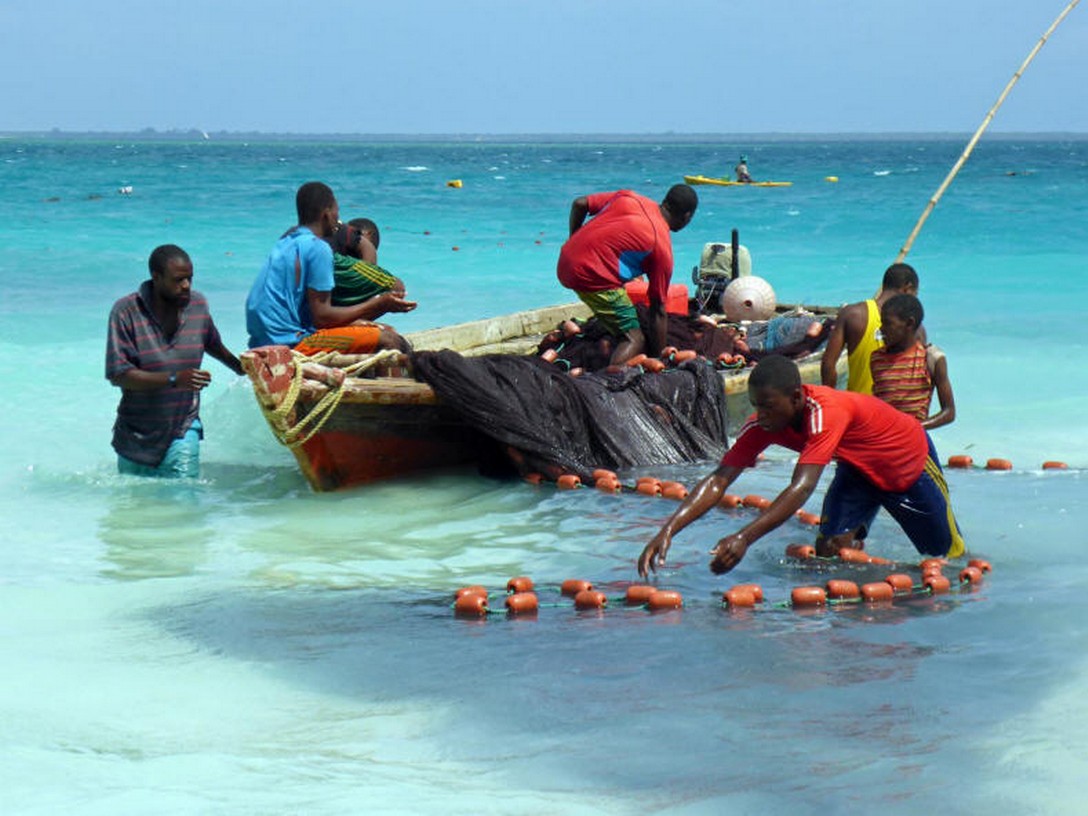 Ein blauer Himmel weckt uns heute Morgen. Es ist noch Flut und das Wasser bedeckt den gesamten Strand. Ich schnappe mir meine Flossen, die Tauchermaske und nehme die Kamera mit. Mal sehen, was sich so im Wasser tummelt. Das Meer ist ziemlich klar heute und die Wellen sind sehr sanft. Leider sind nur kleine Sardinen in großer Zahl zu sehen, einige Trompetenfische und einige etwas größere, die auch auf dem Markt angeboten werden. Sie haben eine Länge von 10-20 cm - wie sie heißen weiß ich aber nicht. Dieselbe Beobachtung habe ich im Übrigen auch an den anderen Tagen festgestellt. Wenn man tropische Fische beobachten will, muss man einen Ausflug auf die vorgelagerten kleinen Inseln machen. Es werden solche Ausflüge vom Hotel aus angeboten und natürlich auch von den Fischern in Kendwa und in Nungwi. Darauf haben wir aber verzichtet.
