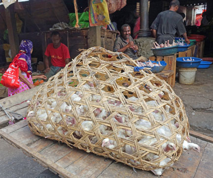 Für Geflügel gibt es eine eigene Markthalle, aber auf die verzichten wir, als wir den großen Korb mit den Küken und jungen Hühnern sehen. Die hygienischen Bedingungen, unter denen das Fleisch auf dem Markt verkauft wird, können natürlich nicht mit denen verglichen werden, die wir von Europa gewöhnt sind.