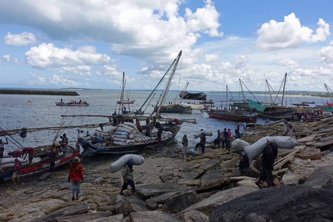 Auf dem Foto wird gerade Holzkohle entladen, die mit den Booten vom Festland herübergebracht wurde. Der von den Fluten zerstörte Kai wurde nicht repariert und die Hafenarbeiter bahnen sich mühsam den Weg über die gebrochenen Betonplatten.