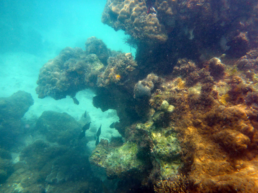 Das Riff ist ziemlich tot; einige Korallenfische tummeln sich zwischen den verbliebenen Korallen. Leider ist das Wasser ziemlich milchig und die Sonne scheint auch nicht richtig. Schade - dabei sah es so gut aus, als wir abgefahren sind.
